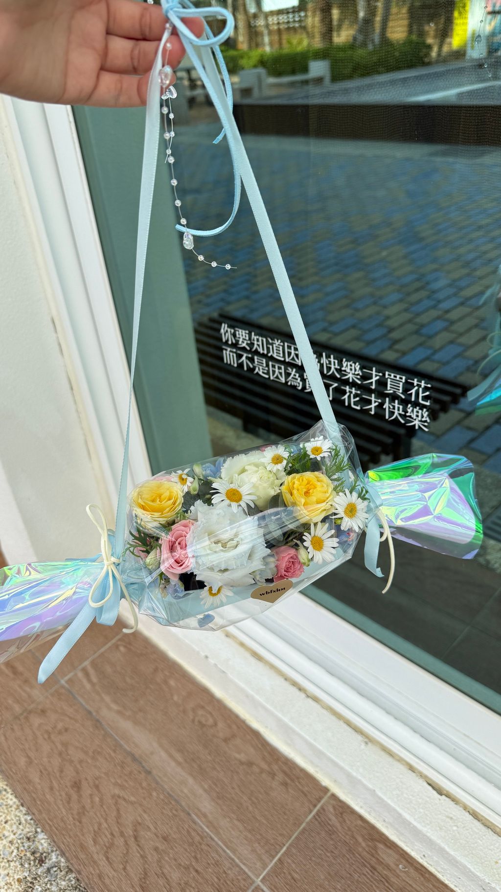 「不只是鮮花,更是一顆藏著春天的巨型糖果。緞帶提把設計,讓美好隨手可提。」