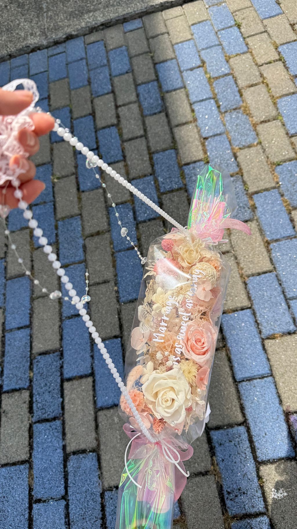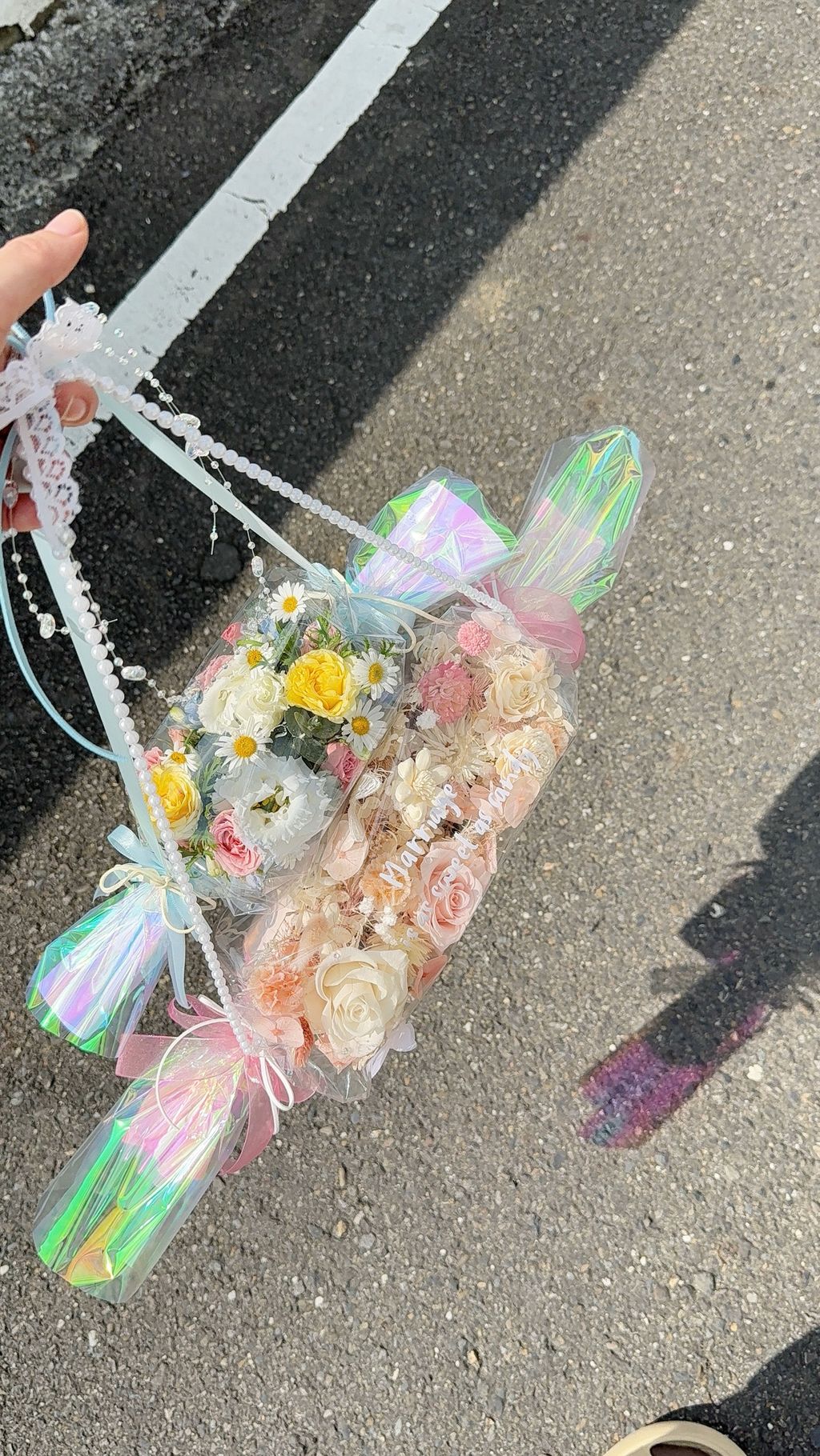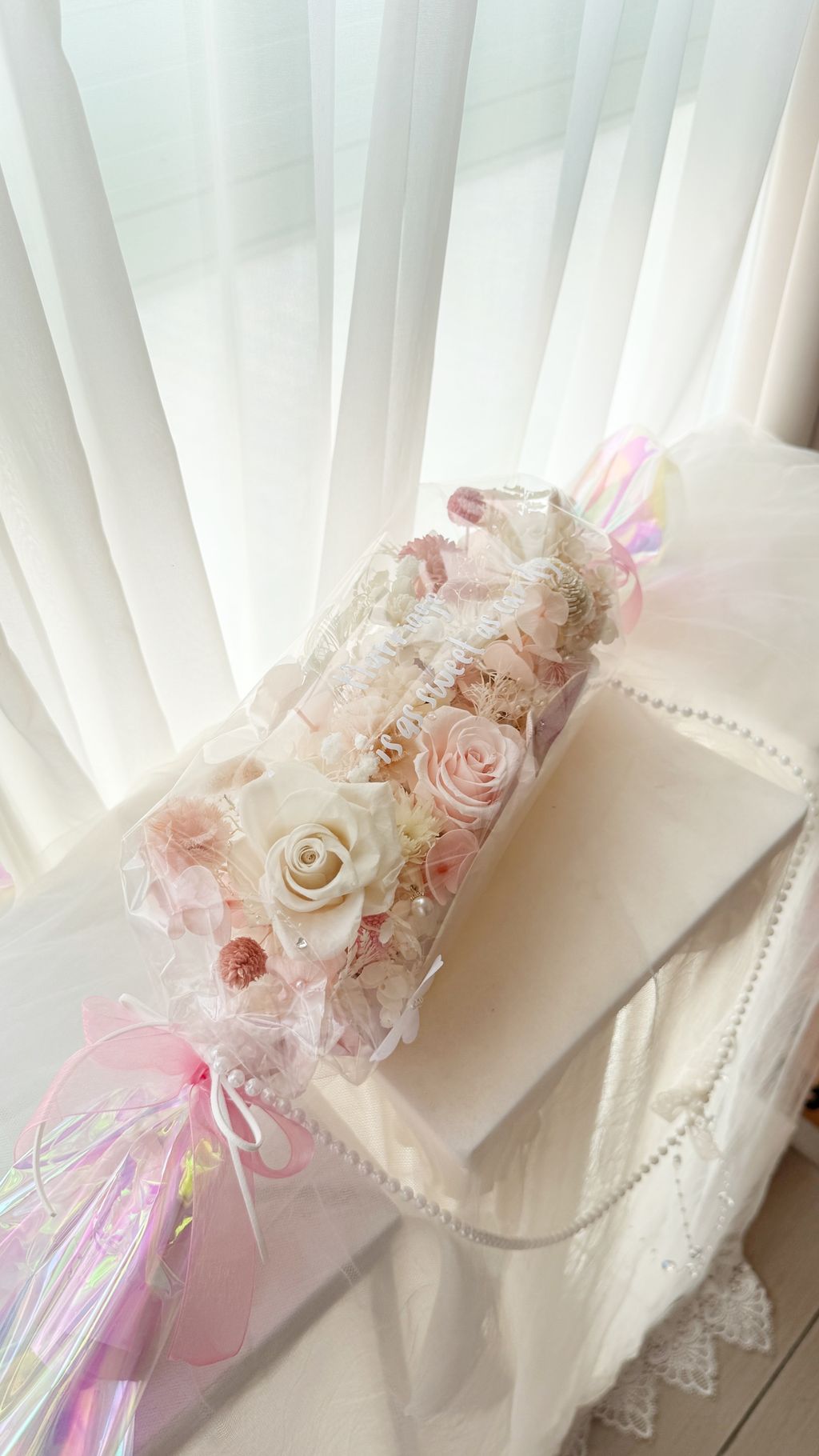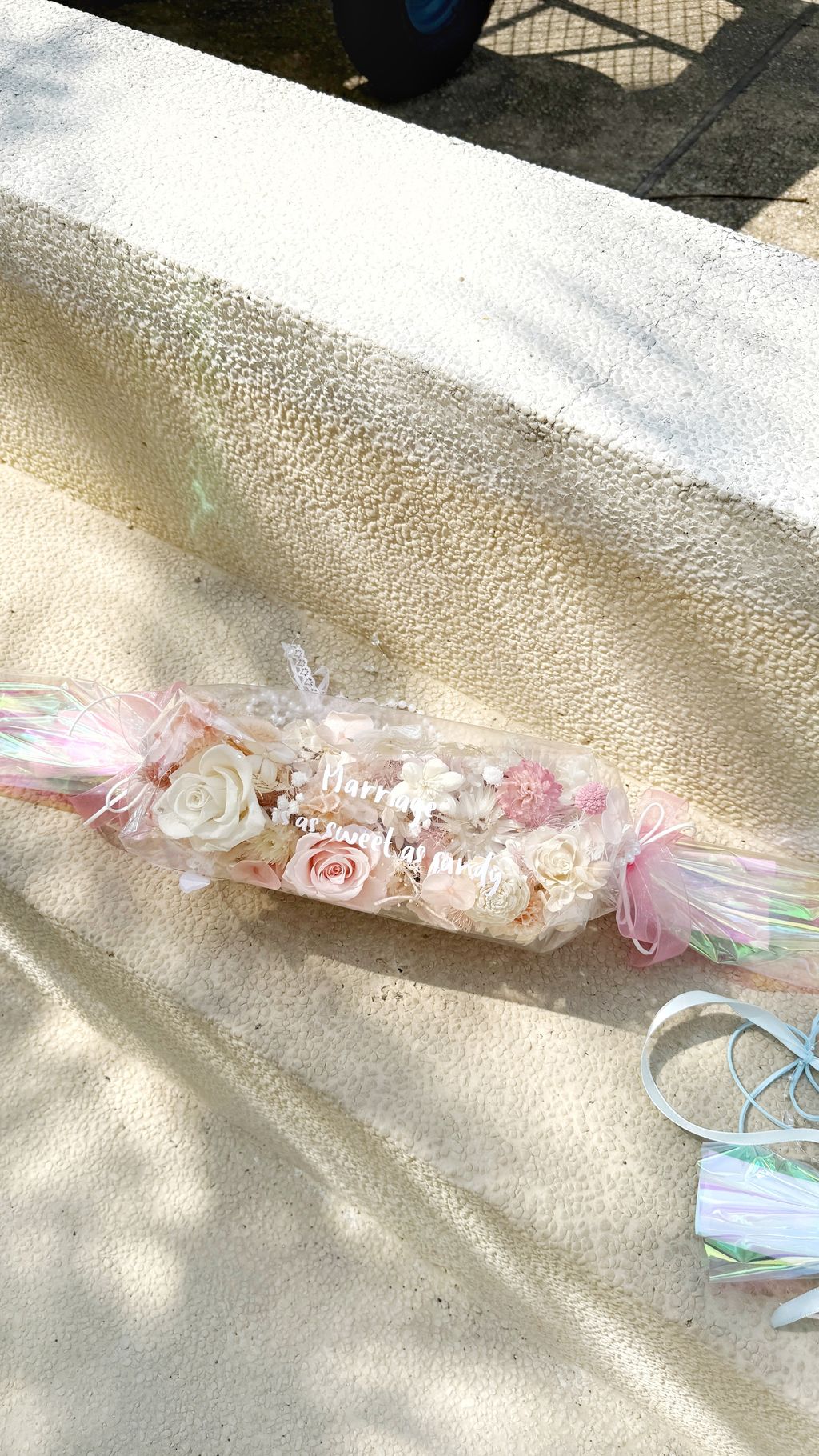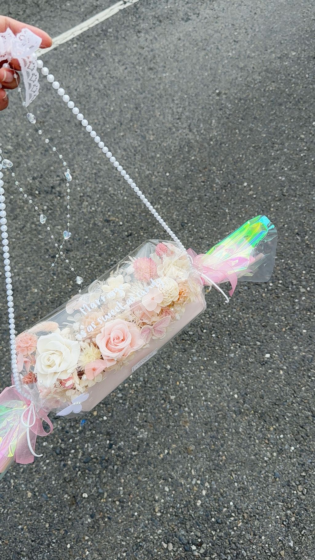 不用手捧,直接勾在手腕上, 這款雷射糖果花在陽光下會折射出彩虹光!