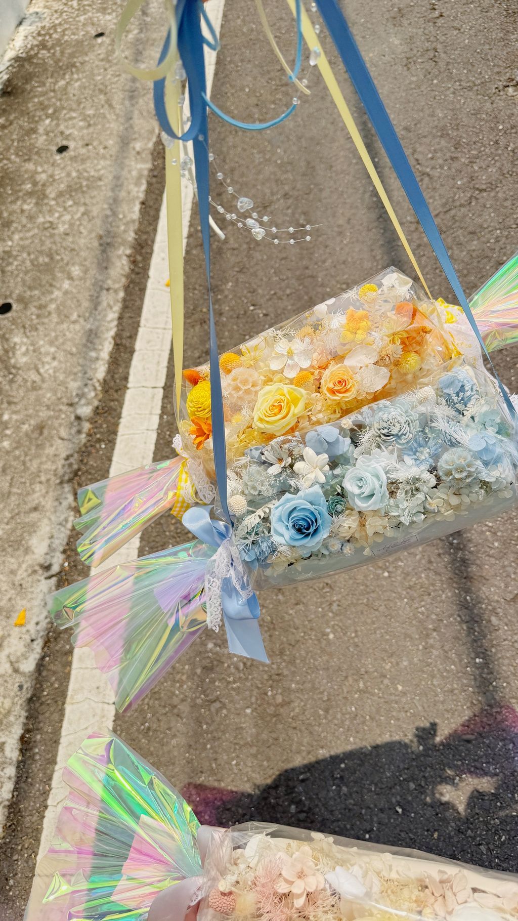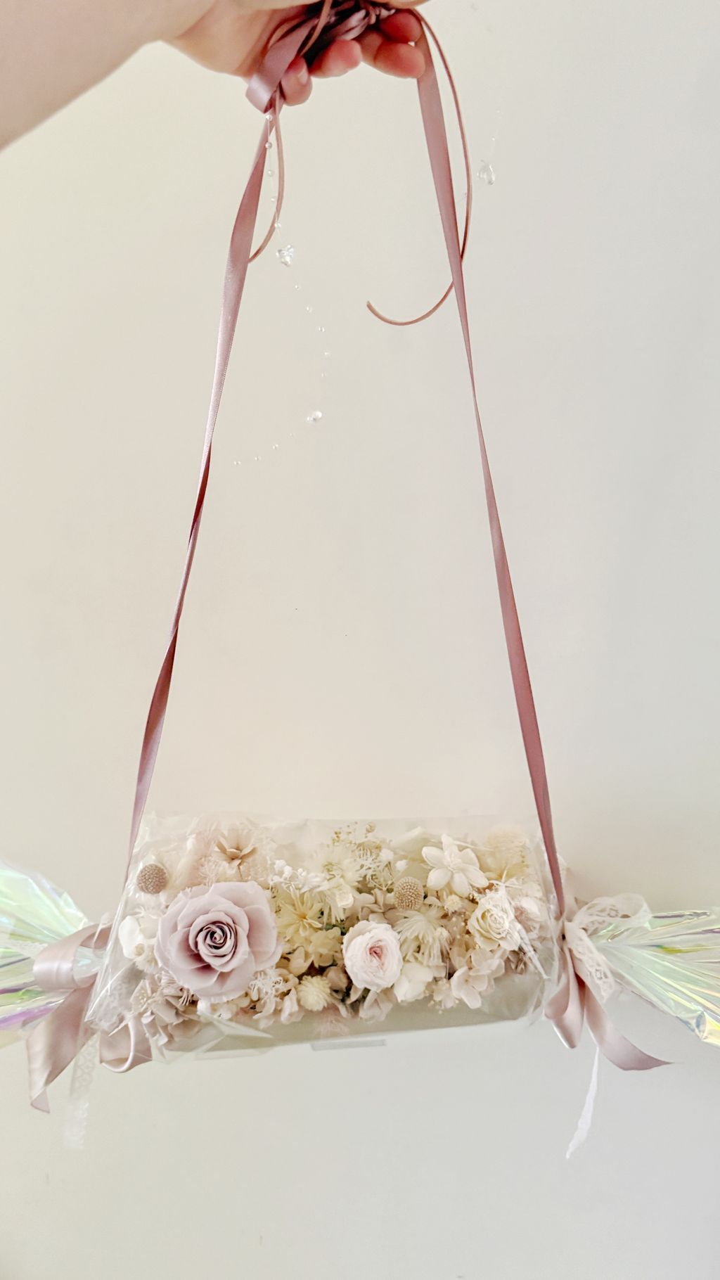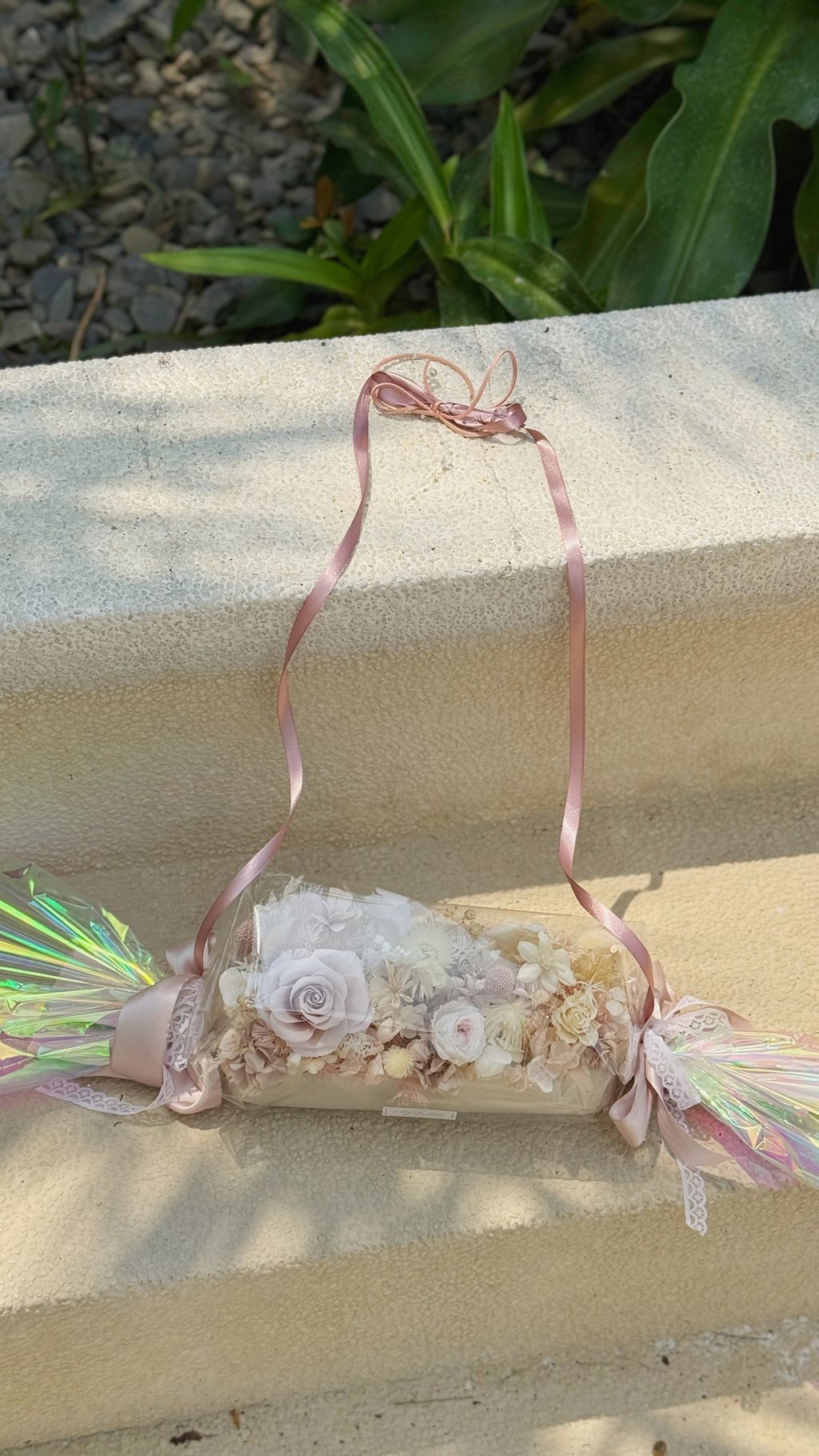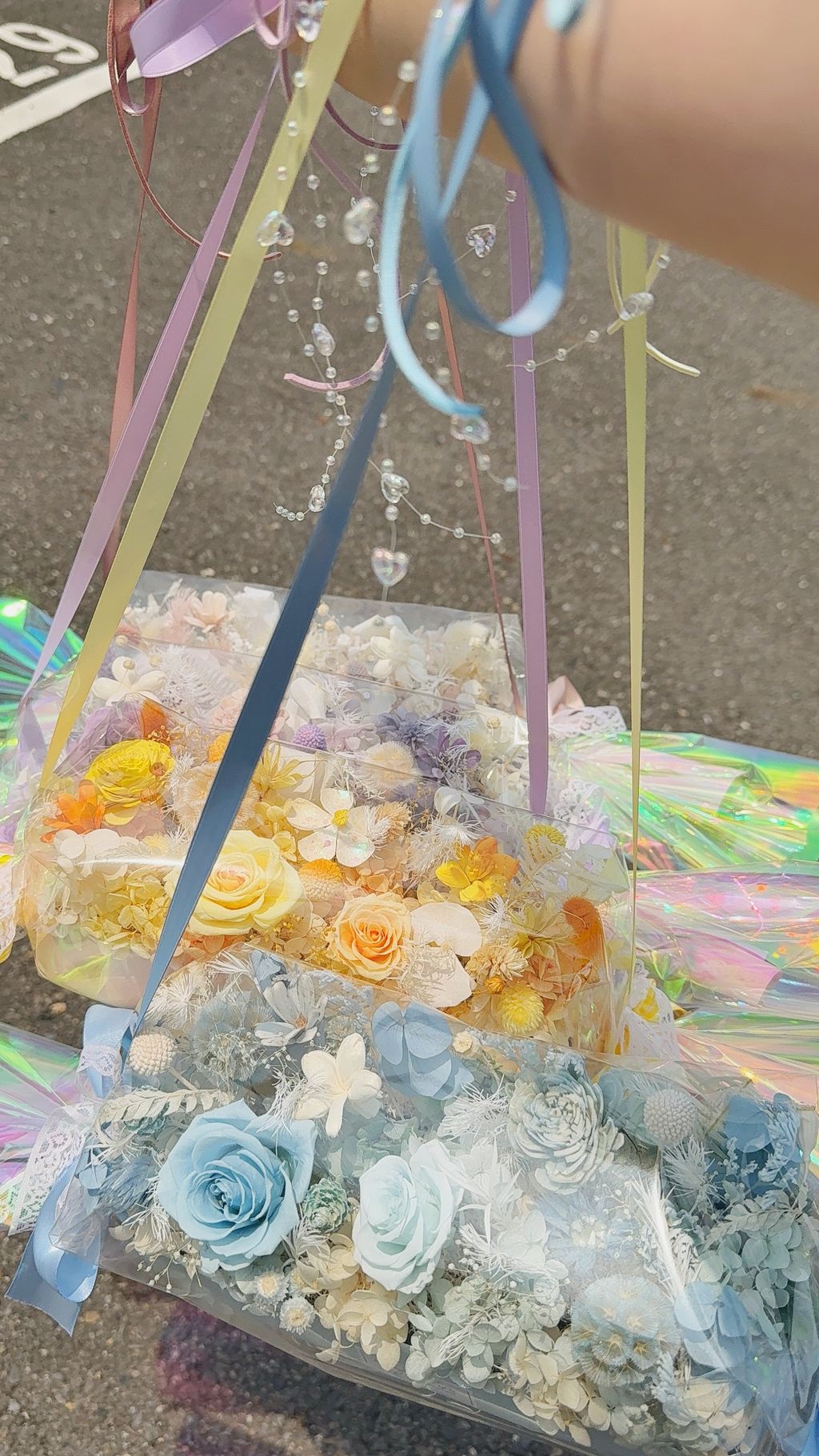 不用手捧,直接勾在手腕上, 這款雷射糖果花在陽光下會折射出彩虹光!